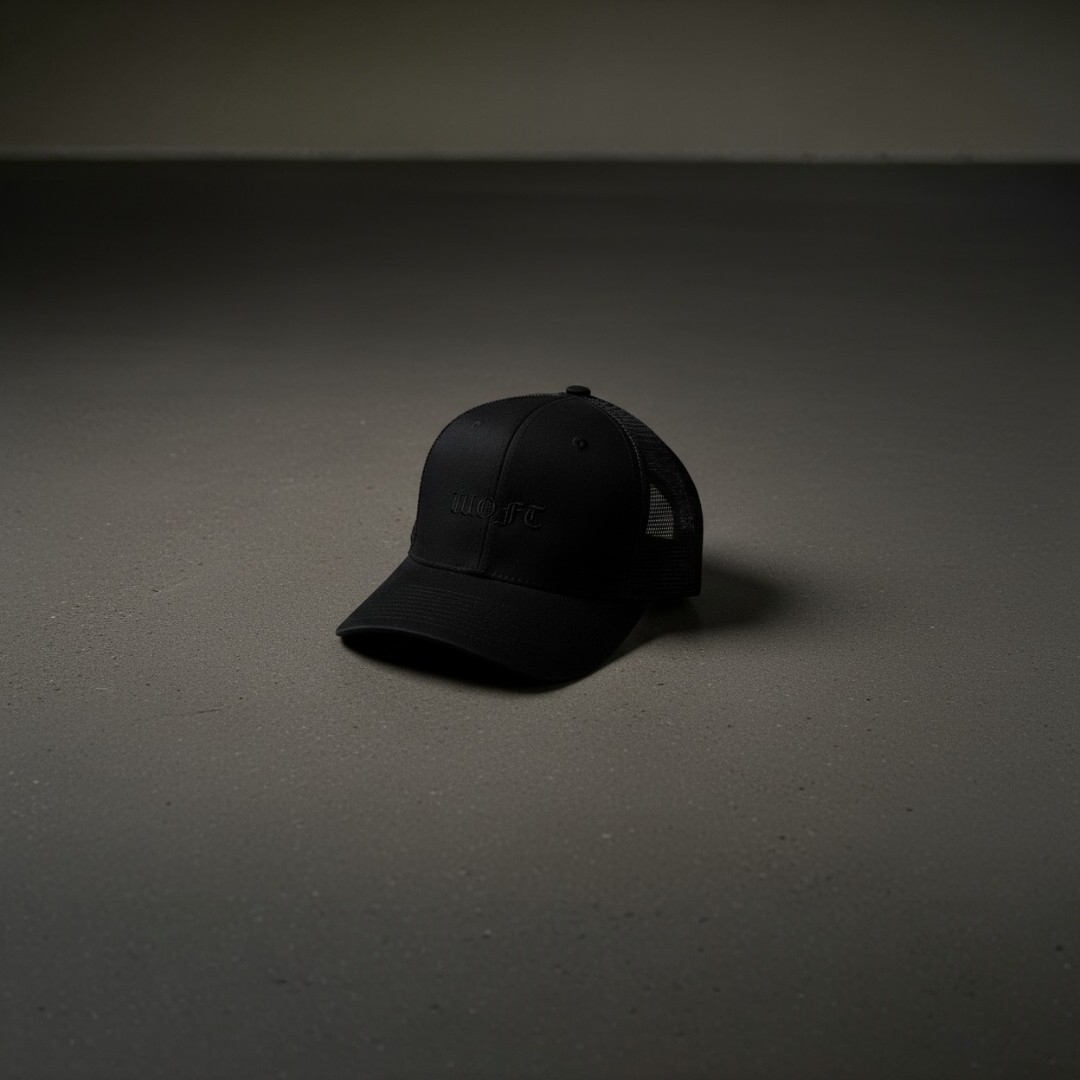 Gorra WOFT Trucker Cap con tipografía gótica negra minimalista al frente. Diseño ligero con panel de malla para mayor ventilación.