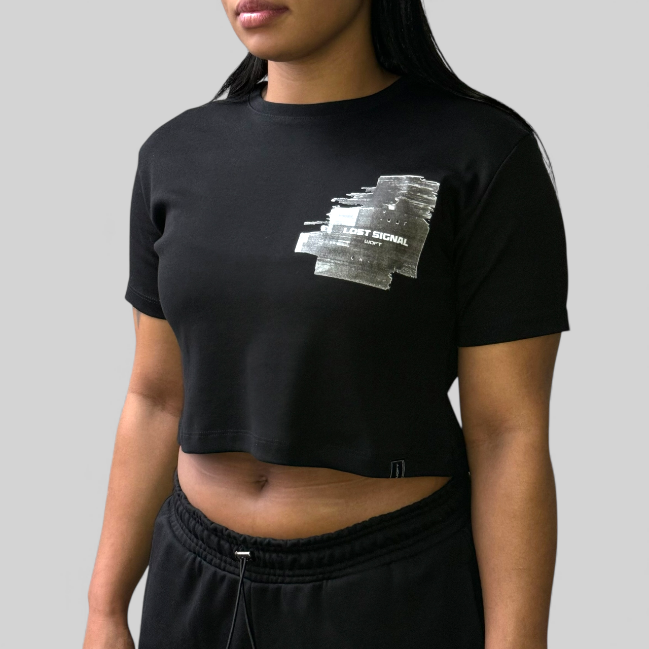 Crop top Lost Signal para mujer. Diseño minimal con gráfico glitch, fit moderno y actitud urbana para elevar cualquier look street.