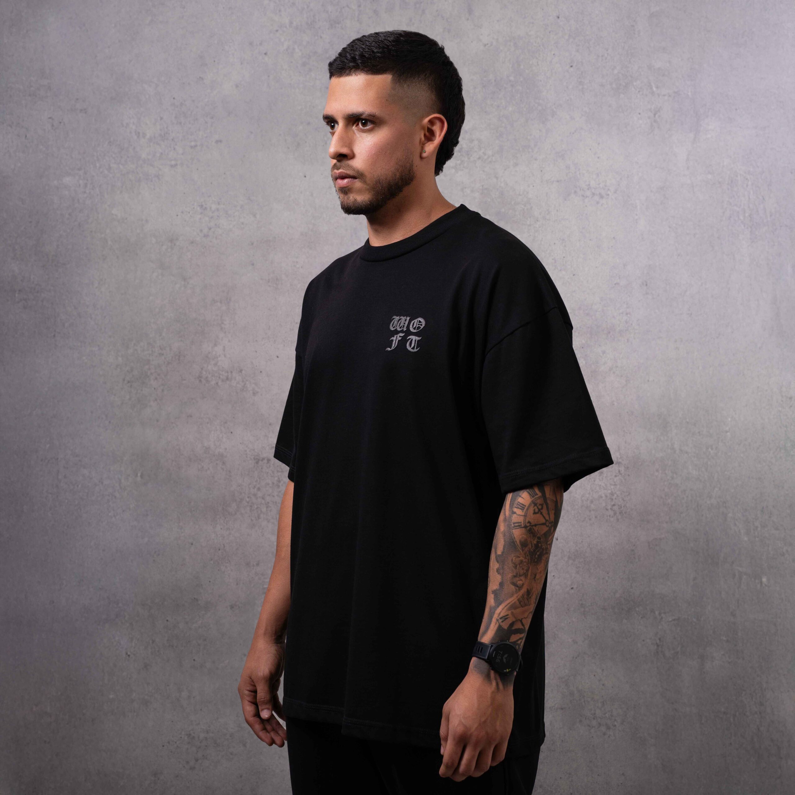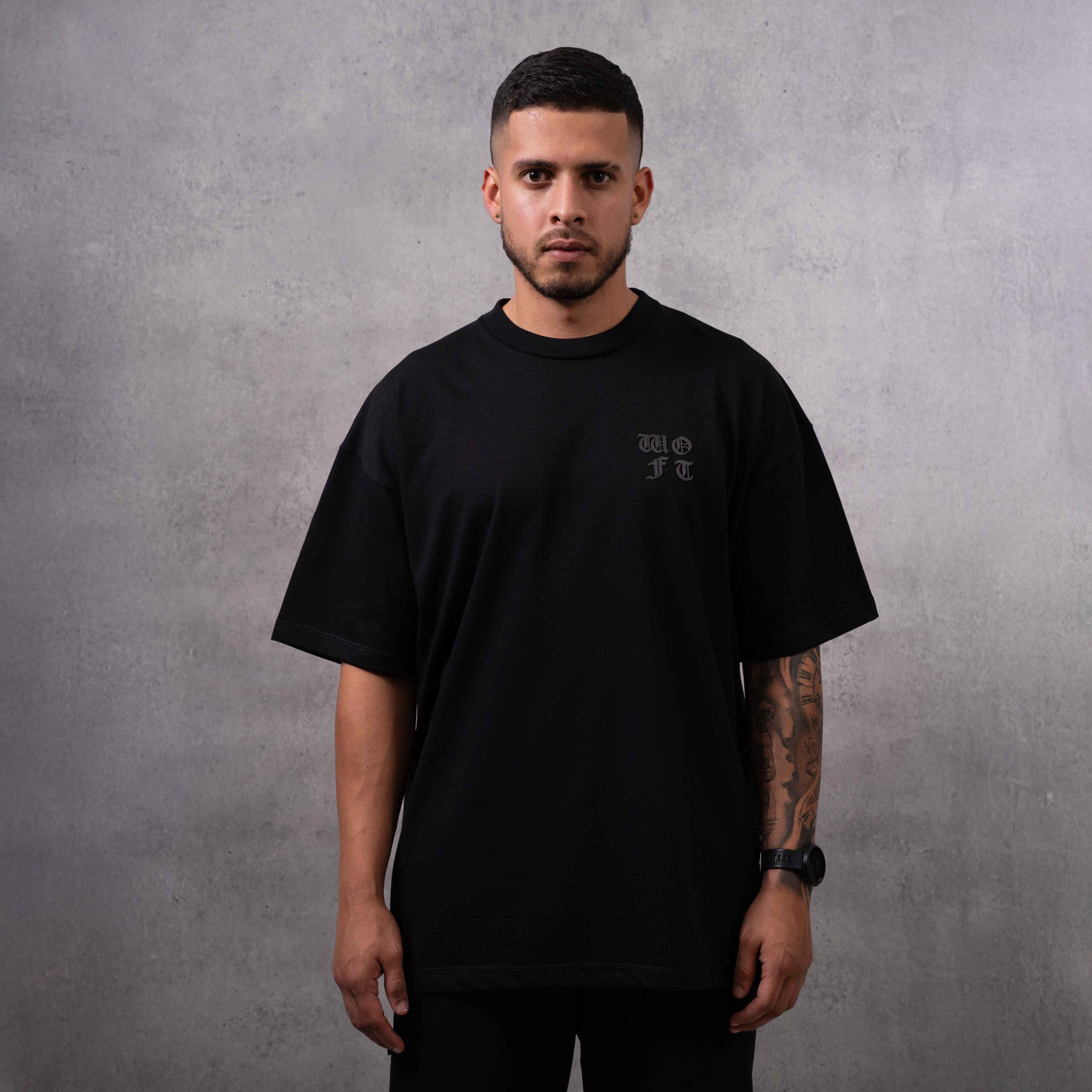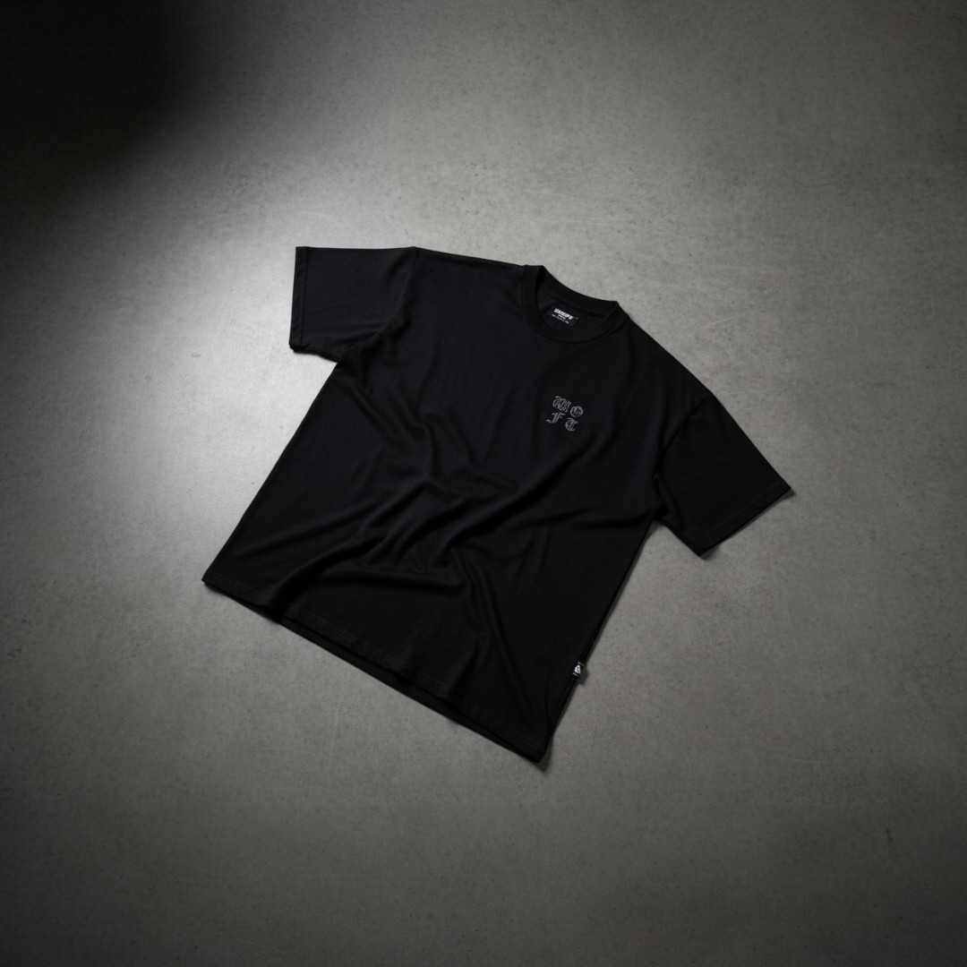 Camiseta oversize WOFT en algodón premium, caída amplia y estética minimal gótica. Logo frontal en tono oscuro para un look limpio, sobrio y urbano.