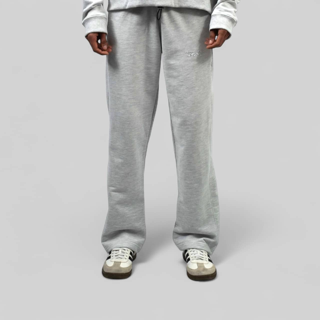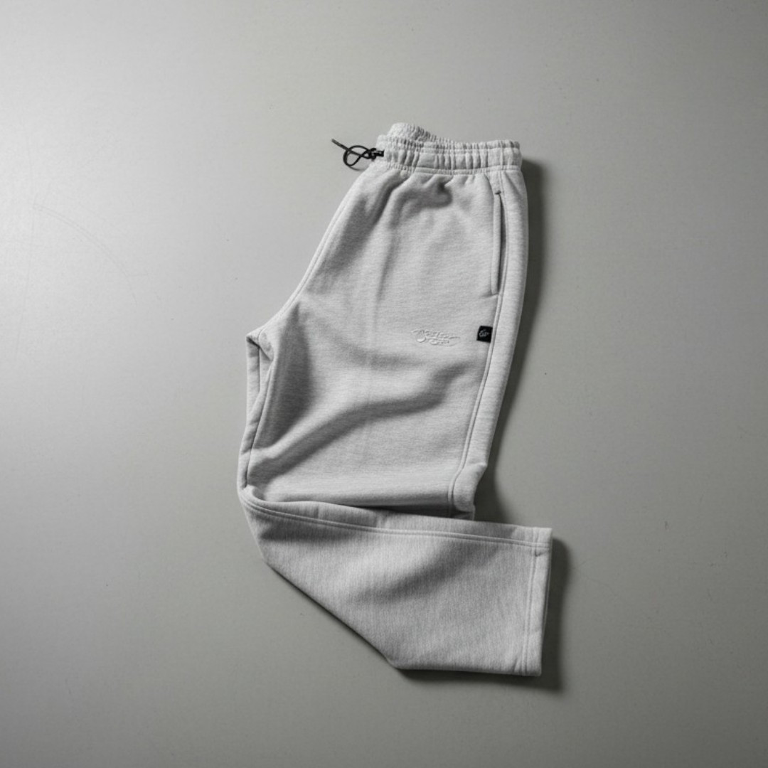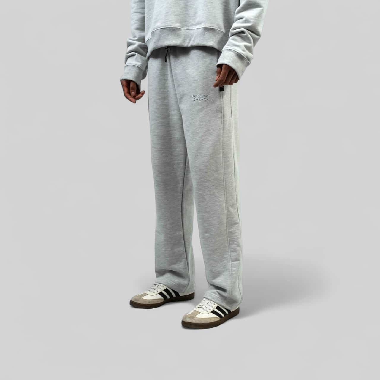 Pantalón tipo sudadera de corte ancho en tono jaspe claro. Confeccionado con un excepcional algodón de 365 gramos, ofrece una caída fluida y una suavidad inigualable que perdura. Su diseño minimalista y corte amplio redefinen la comodidad sin sacrificar la sofisticación.