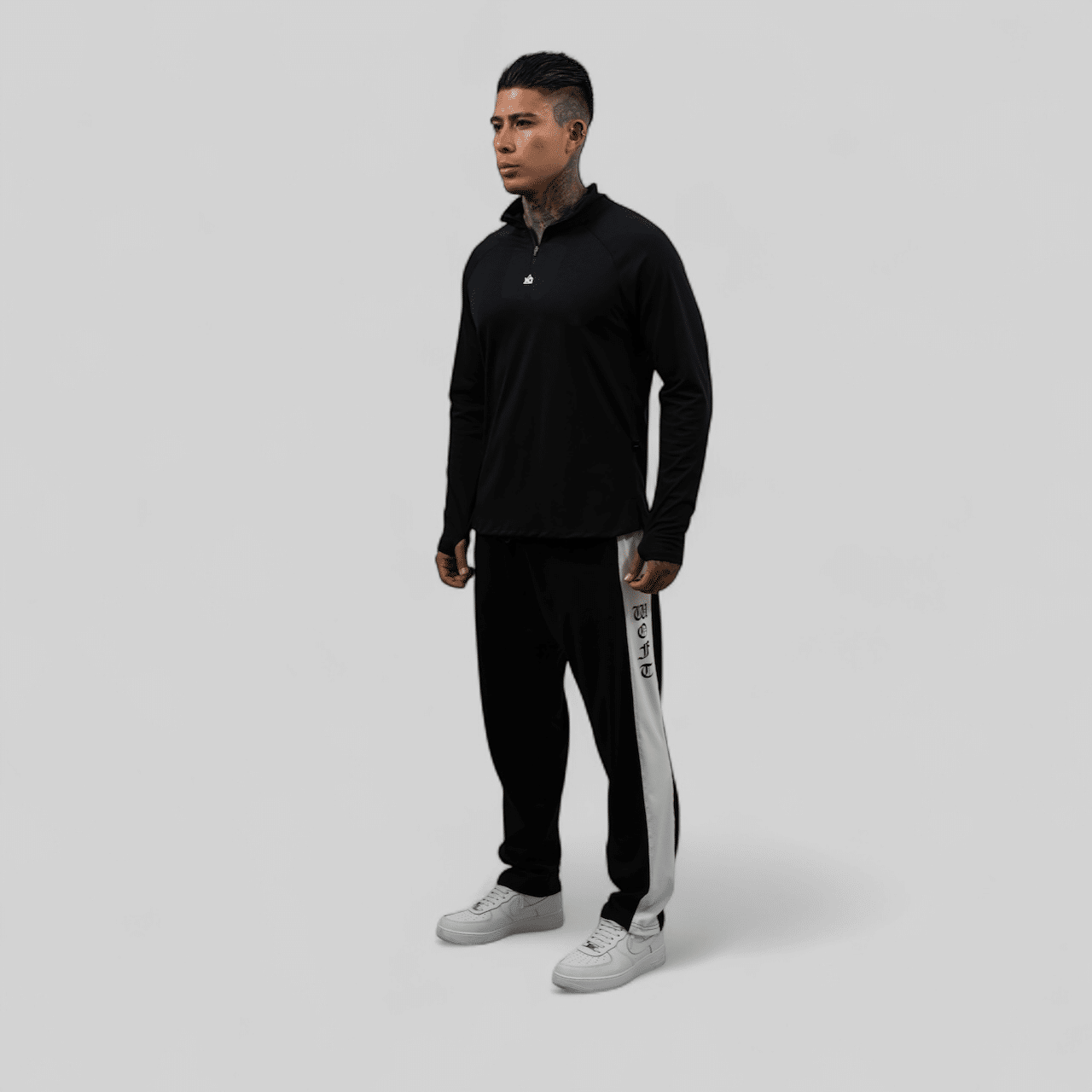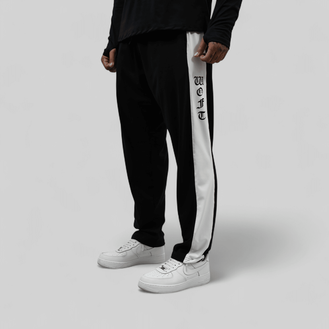 Sudadera deportiva de corte recto, confeccionada en algodon técnico con bloques laterales en blanco que le dan un aire retro y agresivo. El logo WOFT vertical en tipografía gótica remata el diseño con un sello callejero.