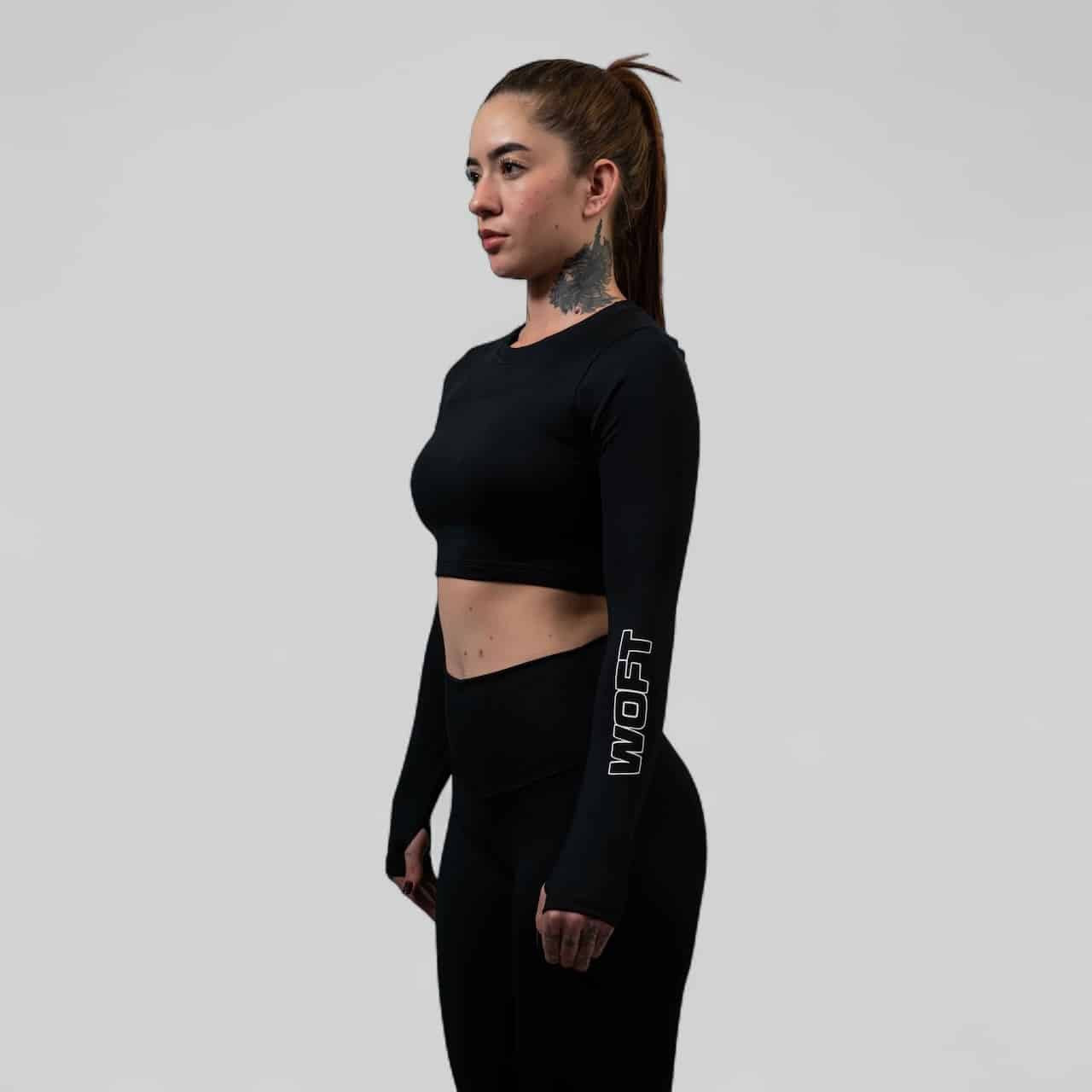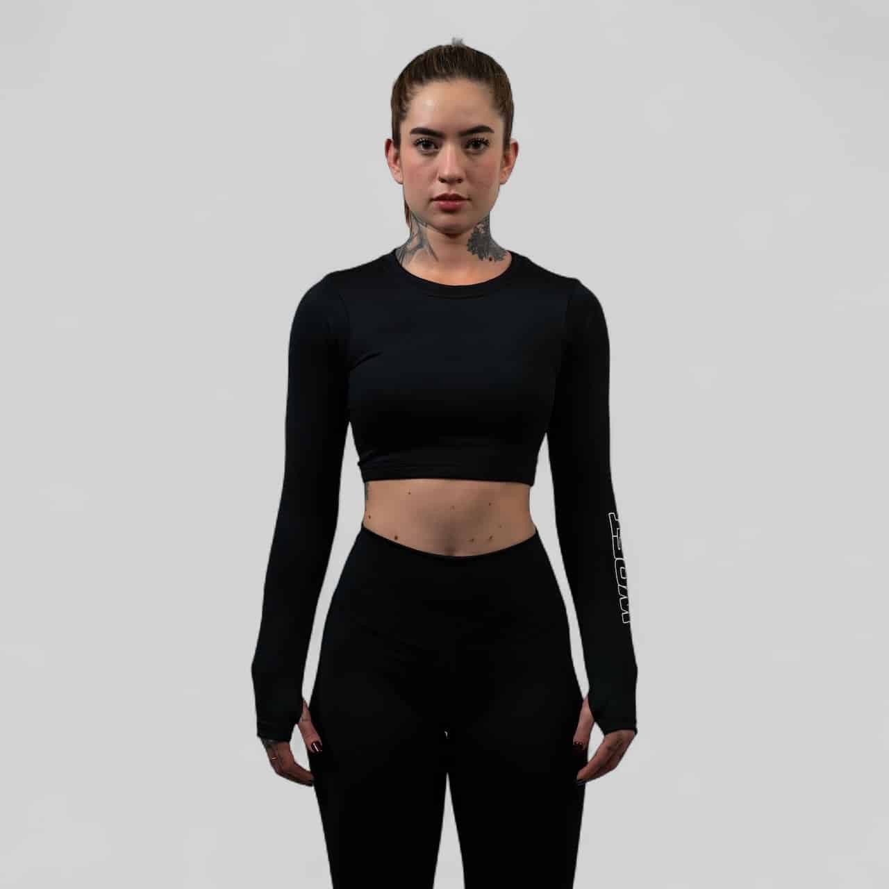 Top deportivo de manga larga con diseño crop. Ofrece compresión ligera, gran elasticidad y una horma que se adapta perfectamente al cuerpo sin limitar el movimiento.